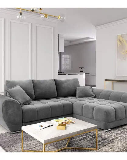 Divano angolare destro trasformabile in velours con contenitore Nuvola grigia - 285x192x92 cm