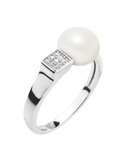 Anello quadrato regolabile in argento, zirconia e perla d'acqua dolce con bottone bianco naturale