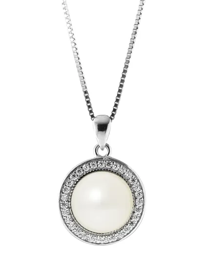 Collana in argento rodiato, zirconi e perla d'acqua dolce Bottone in madreperla bianca naturale