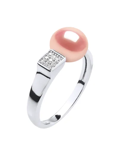 Anello quadrato regolabile in argento, zirconia e perla d'acqua dolce con bottone bianco naturale