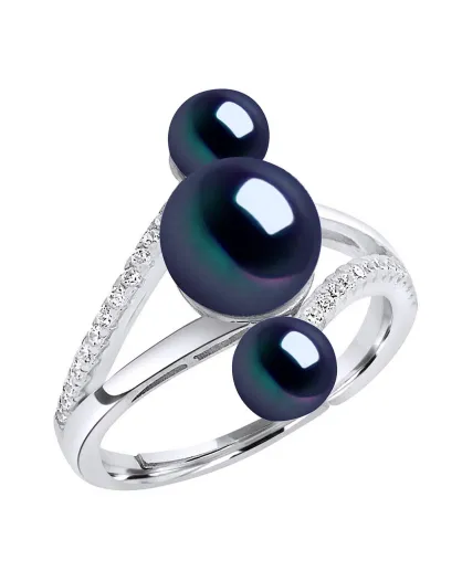 Anello Trilogy in argento rodiato e 3 bottoni neri con perle coltivate d'acqua dolce