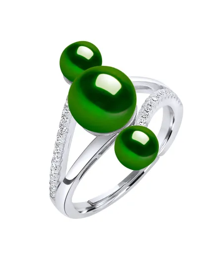Anello Trilogy in argento rodiato e 3 bottoni verdi con perle coltivate d'acqua dolce
