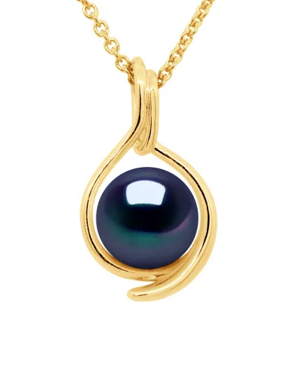 Ciondolo in oro giallo bifacciale e perla coltivata d'acqua dolce rotonda nera