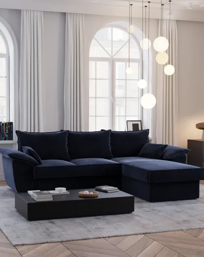Divano angolare destro trasformabile Sasha in velluto blu notte - 257x93/168x88 cm