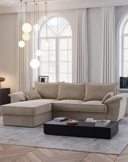 Divano angolare sinistro trasformabile Sasha in velluto beige - 257x93/168x88 cm
