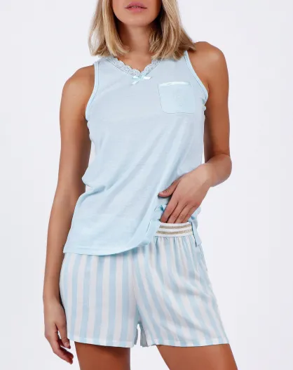 Pigiama blu marino senza maniche Liberty blu e rosa