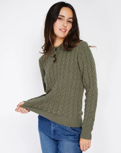 Pullover kaki in misto cashmere con colletto abbottonato