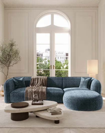 Divano angolare destro Jules Velours in velluto goffrato blu minerale - 278x160x70 cm