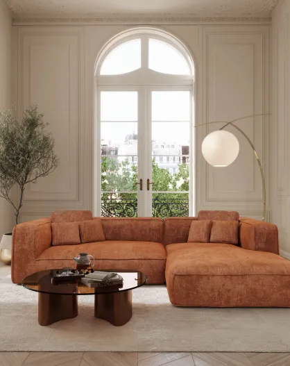 Divano angolare destro LIAM in velluto intrecciato terracotta - 272x90x74