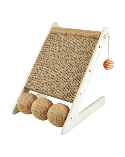 Tiragraffi angolato con palline di juta e giocattoli con struttura in legno 30*28*h.34cm