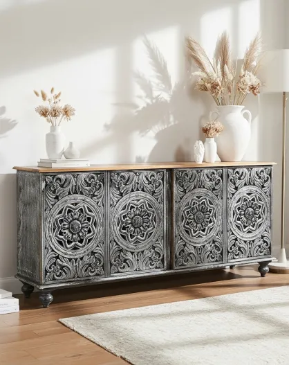 Zaraya - Credenza bassa scolpita in legno massello di mango 185 cm