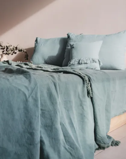 Copriletto in lino con finiture sfrangiate blu 250x250cm