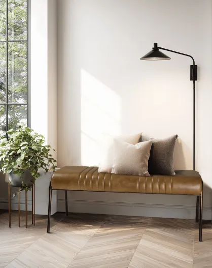 Panca trapuntata in pelle con gambe angolate in legno di mango marrone - 89x32x48 cm