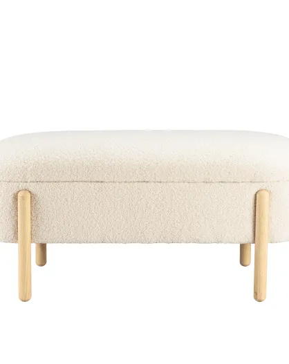 Panca in tessuto bouclé écru con contenitore e gambe in legno