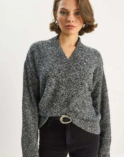 Pullover in maglia nera ed ecru con maniche a pipistrello e topo