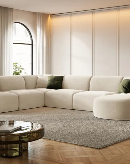 Divano angolare destro panoramico modulare Talia a 7 posti in velluto beige chiaro - 330x255x70 cm