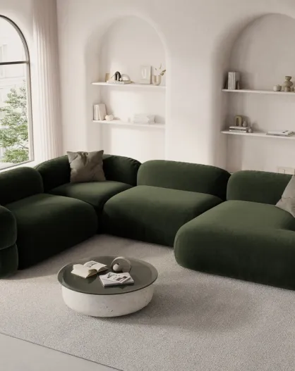 Divano angolare panoramico sinistro modulare Lony a 5 posti in velluto verde - 345x250x68 cm