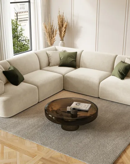 Divano angolare modulare simmetrico Talia a 6 posti in velluto beige chiaro - 255x255x70 cm