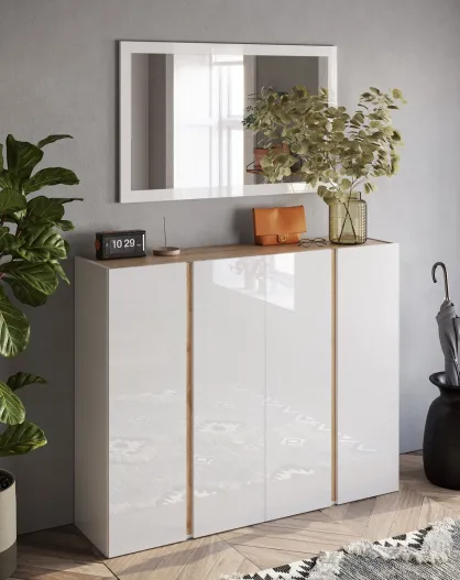 Ferrara - Contenitore a 2 ante con 10 ripiani regolabili in bianco laccato lucido e rovere kadiz - 140x111x35 cm