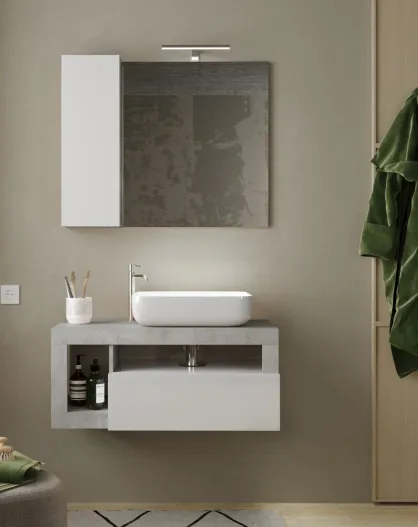 Ancona - Mobile da bagno sospeso Concrete e laccato lucido - 1 cassetto + 2 nicchie + lavabo da appoggio - 92x47x49 cm