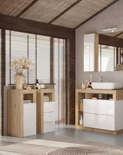 Ancona - Mobile da bagno 3 cassetti in rovere kadiz con frontale laccato bianco lucido - 35x78x35 cm