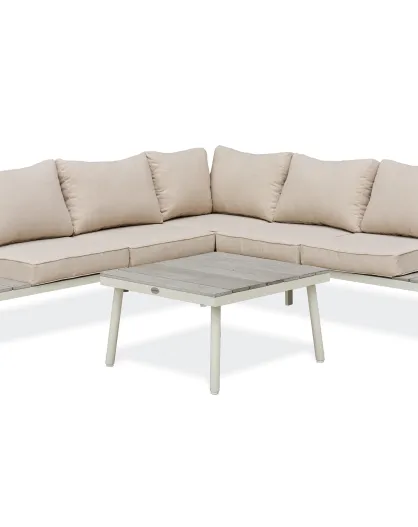 OSAKA, mobili da giardino angolari a 5 posti, alluminio grigio, imitazione legno e alluminio bianco e grigio