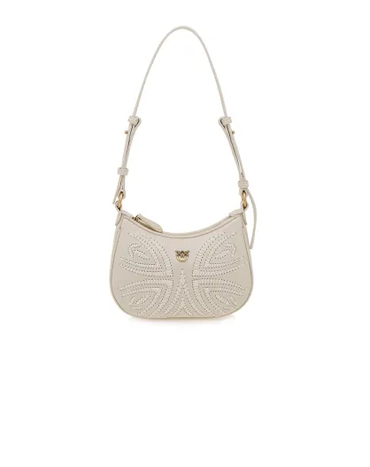 Borsa a tracolla in morbida pelle di vitello a mezzaluna e ricamo in rafia bianca - 19x14x6 cm