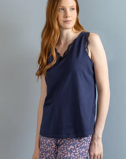 Pigiama blu marino senza maniche Liberty blu e rosa