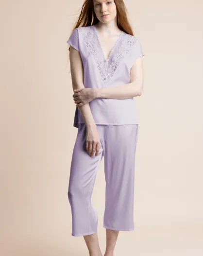 Pigiama color malva in raso e guipure con maniche a goccia