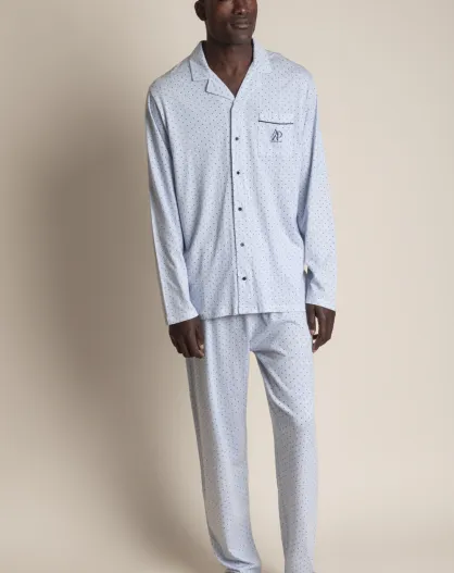 Pigiama classico con maniche lunghe aperte, righe e pois blu