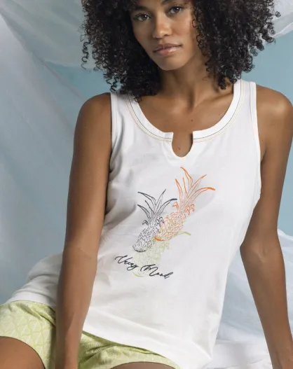 Pigiama senza maniche, motivo a fiori di sole verdi