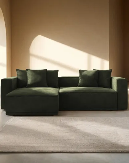 Divano angolare sinistro trasformabile in velluto a 3 posti con baule verde Ribes - 266x160x88 cm