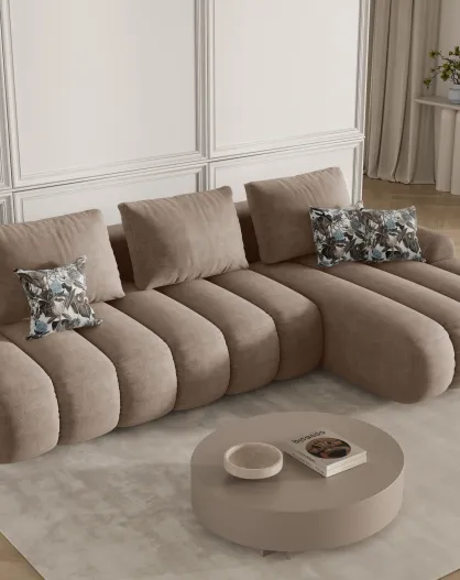 Divano angolare destro in velluto beige scuro a 4 posti Simona con contenitore - 275x142x84 cm
