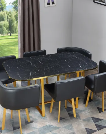 Set tavolo e 6 sedie Oslo XL effetto marmo dorato ed ecopelle nera - 150x90x75 cm