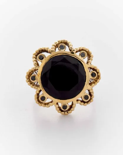 Anello in argento e ottone con onice nera dolce e zirconi neri