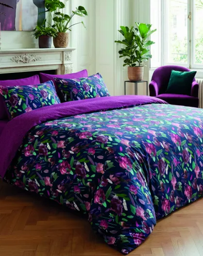 Copriletto Arty flowers in raso di cotone blu scuro - 220x250 cm