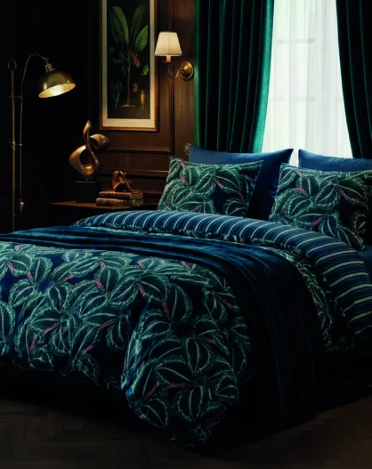 Piumino Calathea in raso di cotone con nappine blu scuro - 140x200 cm